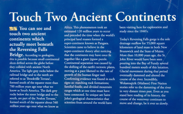 I tried reading the important placard but got bored about half-way through. It seems like a very pompous way of saying: "At high tide the ocean level is above the river and therefore sea water rushes up the river. At low tide the ocean level is below that of the river and therefore the river water runs into the sea." There was only one other couple observing the Reversing Falls and they were really into it. This was their second visit that day; they had come earlier in the day to watch the river during high tide and now had come back to witness it during low tide. "You know", the guy said, "if I hadn't been here this morning to see the river flowing in a different direction than it is now, I wouldn't have thought this river so special. It would seem like any other river." "Exactly", thought I, being there for only one tidal experience. The couple insisted I take pictures of the river even though I thought they would be boring. Later, when I looked at the pictures, I confirmed that they indeed were boring. I will spare you the boring river pictures, but here is a picture Di took of the couple exhorting me to take more (boring) pictures.